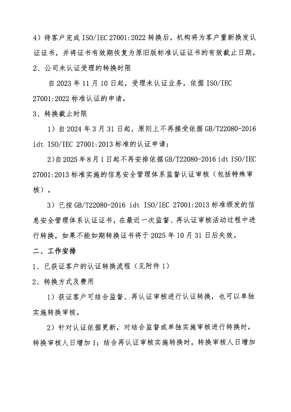 3.所有已获证客户的换版时间不晚于ISO/IEC 27001:2022发布月份最后一天起36个月,即2025年10月31日。